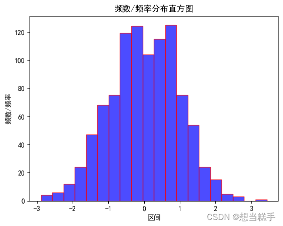 # norm_hist:一个布尔值,用于控制直方图是否应该被归一化为密度估计。当True时,直方图的高度表示概率密度而不是频率。默认值为False。