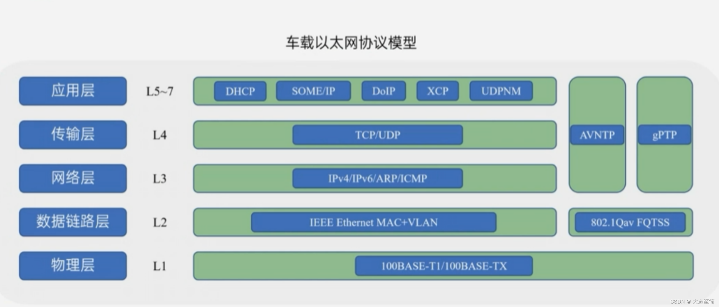 基于OSI模型的车载以太网 1、帧格式:使用与传统以太网相似的帧格式,包括前导码(8字节,同步和定时)、起始帧界定符(标志前导码结束)、目标MAC地址(6字节)、源MAC地址(6字节)、长度/类型字段(2字节表示数据字段长度、上层协议类型)、数据字段、帧校验序列(4字节,接收端校验)。3、IP协议族:车载以太网的网络层不仅包括基本的IP(IPv4和IPv6),还包括与IP相关的协议,如ARP用于IP地址与MAC地址的解析,ICMP用于网络状态和错误报告。2、多媒体和娱乐系统:支持多媒体和娱乐系统,如音频播放器、视频显示和控制界面等。