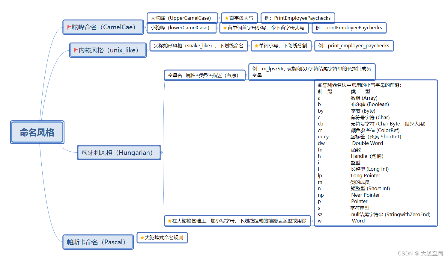 C语言编程规范 【描述】一个标识符的好坏很大程度上取决于标识符名称。用于单、多行注释,/**/不嵌套/**/,/**/可嵌套//。【规范】业界共四种命名法则:驼峰命名、匈牙利命名、帕斯卡命名、下划线命名,前三种较流行。【描述】代码风格指编写代码遵循的规则和约定,旨在提高代码的可读性、一致性、可维护性。任何时候,*宜跟随变量名或函数名,除非右侧没有变量或函数名,可以跟随类型。【规范】不冲突、不过长过短,作用域越大,描述越精确。、安全、可靠、可测试、高效、可移植。【注意】注释内容也可能是存在格式的。