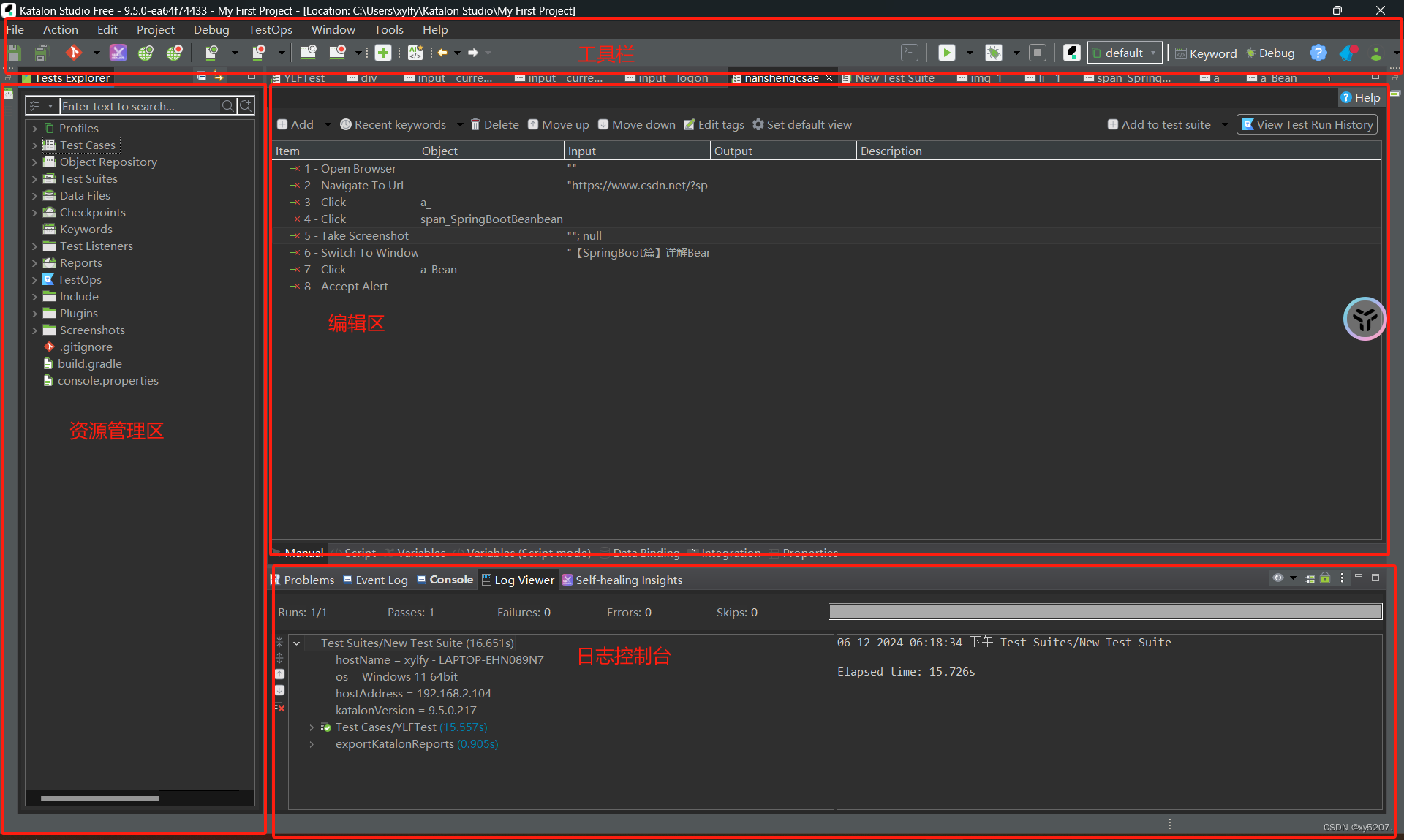 【katalon studio学习1界面功能介绍】 前面两个是保存和保存全部的按钮,中间两个按钮是各种设置的快捷入口,后面三种分别是Web、Mobile、桌面程序的Spy(元素捕捉)和Record(录制) 按钮,最后那两个用来运行和调试脚本Spy (元素捕捉):打开相应的页面,选择需要保存的“元素”(后面菜单会提到)。Record(录制):录制脚本,不仅可以录制操作的步骤,而且连关联的元素也会一起保存起来。使用 Katalon Studio 工具进行 Web 自动化测试:能够迅速执行诸多大量重复的任务。