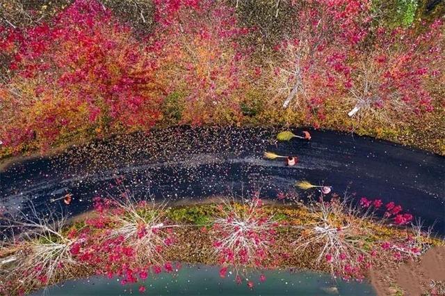 散落在地上的红叶与树上的叶子,融为一个画面,就像绽放的烟花。