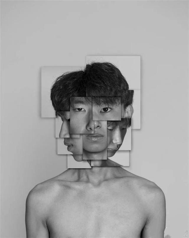 照片的主体在面部,面部由数张不同情绪的表情拼贴而成。