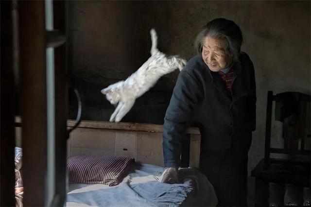 但是作者抓拍的很有意思,一只白色的猫作飞身状,一位老奶奶在身前回看猫咪。