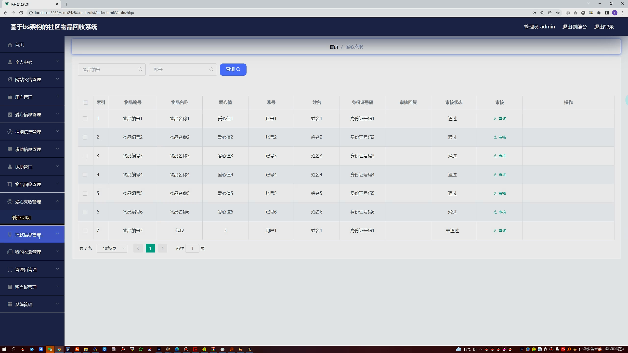 基于bs架构的社区物品回收系统设计与实现源码基于bs架构的社区物品回收系统设计与实现源码本系统可以分为:用户使用的功能、回收员使用的功能、管理员进行管理的功能。用户使用功能:针对订单和接单信息的查看和管理,以及基础个人信息的修改。回收员使用功能:针对订单和接单信息的查看和管理,佣金信息的查看管理,以及基础个人信息的修改。管理员管理功能:针对订单和接单信息的查看和管理,佣金信息的查看管理,商品类型和信息管理,用户的个人数据和回收人员的个人数据的管理,以及基础个人信息的修改。1.运行环境:最好是java jdk