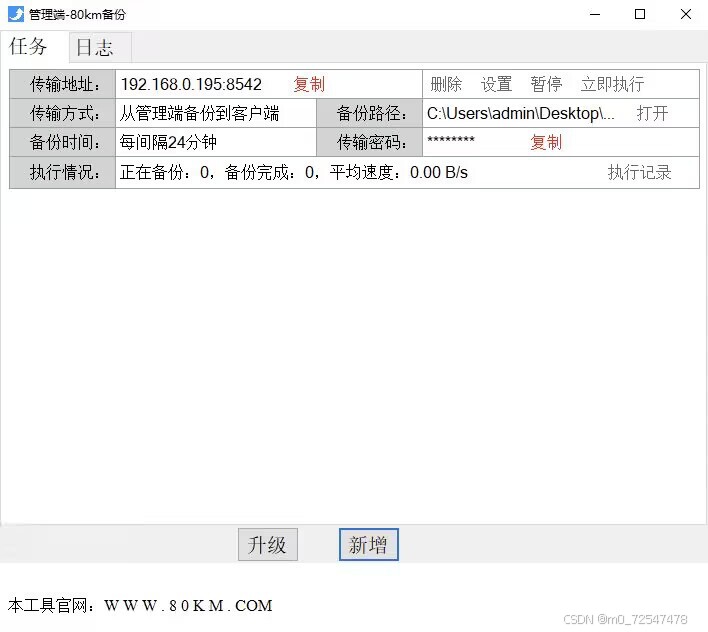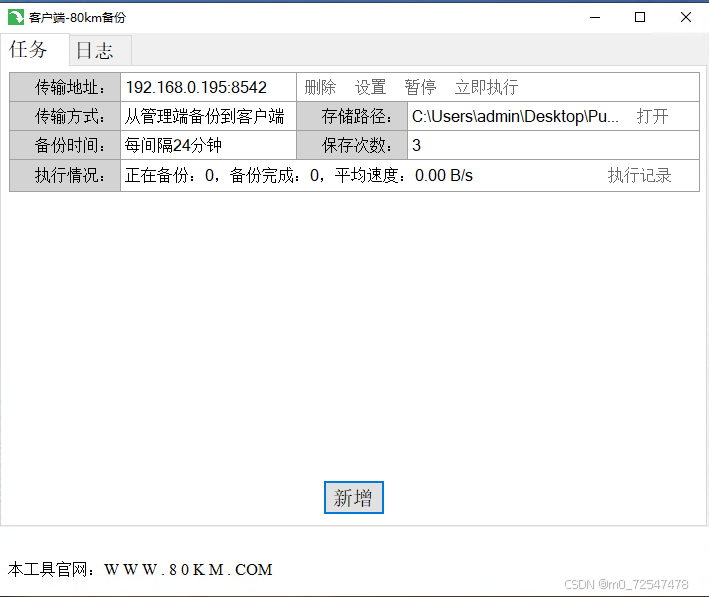 当然,除了上述步骤,还有另一个方法可以实现数据的定时备份,那就是80KM备份软件,这个工具可以进行很复杂的备份方式,比如:A备份到B、B备份到C、C备份到D、D备份到A等,也可以内网对内网备份、也能内网的数据备份到公网IP上,也可以公网备份到内网家用电脑上,也可以定时备份MySQL、MSSQL、access等各种数据库。它的使用方法如下: