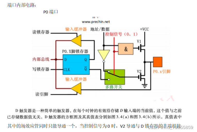 P0端口:当向端口写0时,经过锁存器的非端输出1,此时V2导通,输出低电平,外部电路以灌电流形式流入V2再流向地