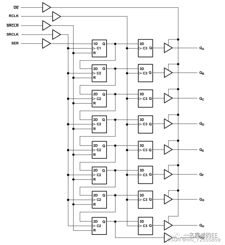 74HC595芯片:内部电路图如下所示;RCLK与端口的锁存器相接,端口锁存器数据来源于移位寄存器的值,在RCLK上升沿,移位寄存器所有数据传入端口锁存器; 移位寄存器的值来源于SER串行输入端口,在SRCLK上升沿数据依次传入移位寄存器,并且前一个寄存器的值又作为后一个寄存器的值,所有从SER输入的数据依次后移;所以要正确读取输入数据应该等SER串行数据输入完成再将SRCLK拉高,一次性读取移位寄存器数据到端口。更详细参考:74HC595使用