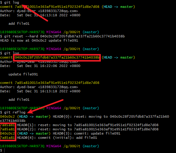 在Git中,用HEAD表示当前版本,上一个版本就是HEAD^,上上一个版本就是HEAD^^,当然往上100个版本写100个^比较容易数不过来,所以写成HEAD~100。