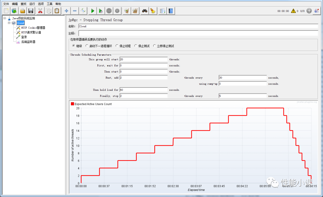 单场景压测被测系统的登录接口,压力曲线模型如下: