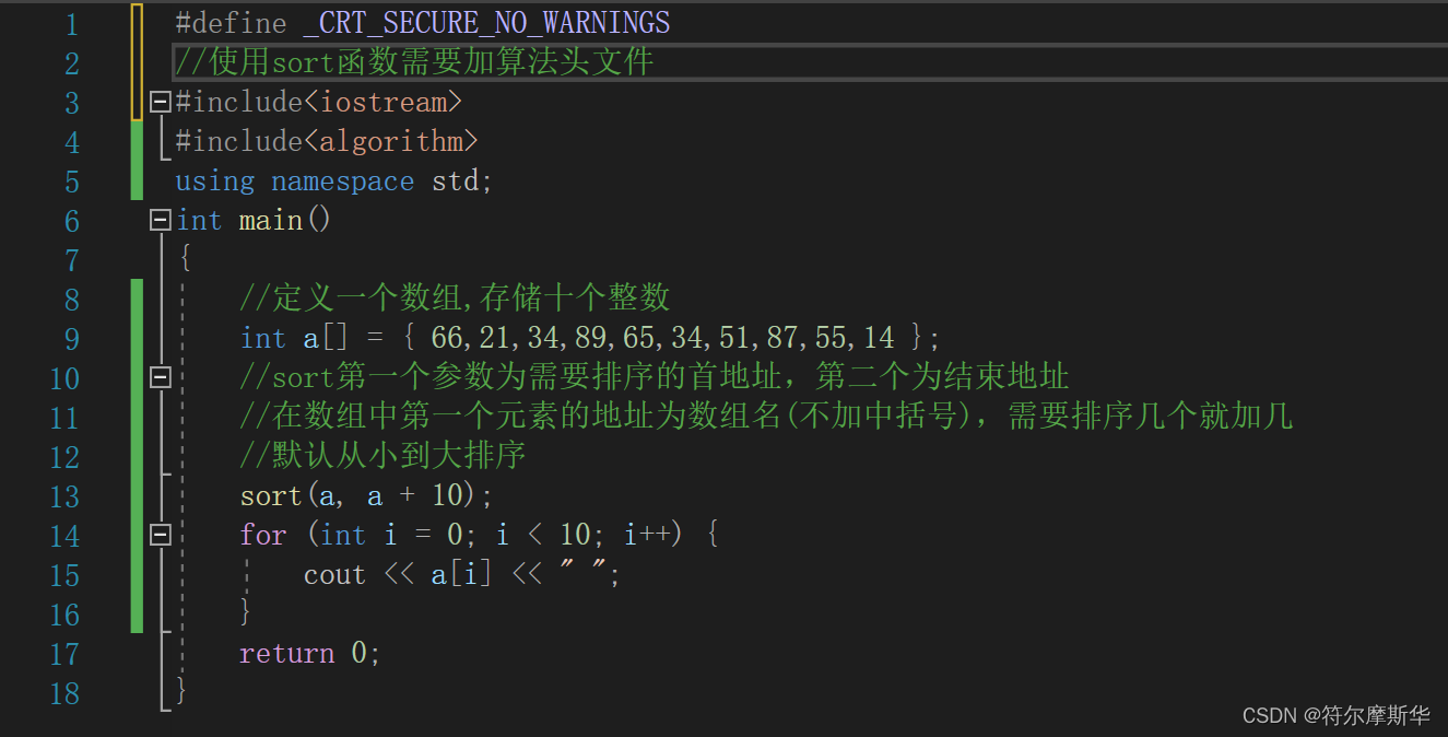 sort排序的用法 第一个参数指向第一个元素的指针,第二个参数指向最后一个元素下一个位置的指针,cmp不写默认从小到大排序。在数组中第一个元素的地址为数组名(不加中括号)使用sort()函数需要加算法头文件。自定义一个比较函数放在第三个参数。第一种用法:从小到大排序。第二种用法:从大到小。