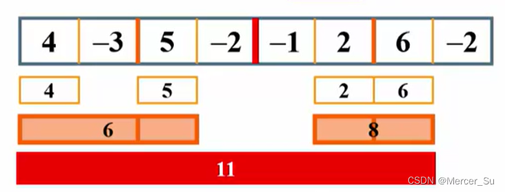 个人笔记——数据结构与算法(1.3实例应用与分析) AN},求函数 的最大值,若值为负数,则放回0。思路:分:将数据分为左右两块,再左右两边以此递归(再次分为左右两边),足够小,求出当前最大。所以T(N)=O(N)+O(N log N)\\ 相加取最大,时间复杂度为O(NlogN)第三个数字:-2,使得ThisSum=1MaxSum , 更新 , MaxSum=5。思路:当前子序列和为负数时,不会为后续子序列和提供价值,舍弃,保证当前答案的正确性。