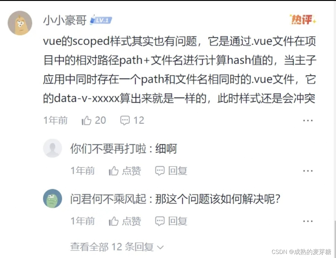 Vue 的 style 加了 scoped 也会样式冲突? 最近在看一篇微前端的文章的时候,看到了这么一个评论,瞬间引起了我的求知欲,这个评论是这样的可能有些人不知道微前端是啥,也不知道 主应用 和 子应用 是啥,我画一个图给大加简单展示一下吧:在这里再说一下 vue 文件的 scoped style 是怎么做到样式隔离的,其实就是 vue解析器 在解析 vue 文件的时候,会通过内部的一种计算方法(怎么算的后面会说),给每一个 vue 文件的 html 标签加上 data-v-xxx 这样的属性,接着通过 属性选择器 ,来进行样式隔离,也叫样式模块化。