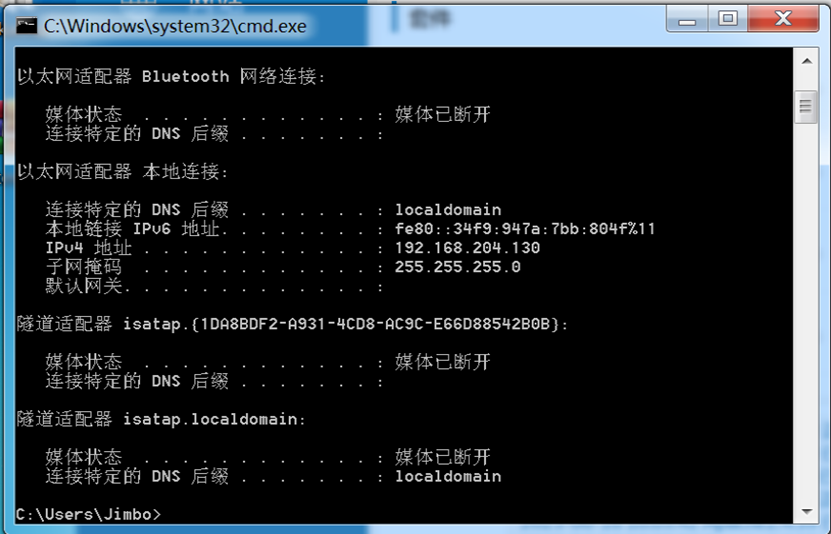 虚拟机中打开命令行,输入ipconfig,记录以太网适配器的 IPv4 地址(如192.168.204.130)。
