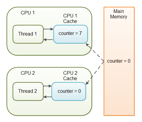 如果counter变量没有声明成volatile,则counter的值不保证会从CPU缓存写回到主存中。也就是说,CPU缓存和主存中的counter变量值并不一致,如下图所示: