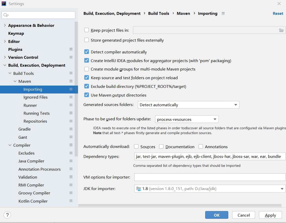 settings—》Build,Execution,Deployment—》Build Tools—》Maven—》Importing—》JDK for importer选择你安装的JDK版本