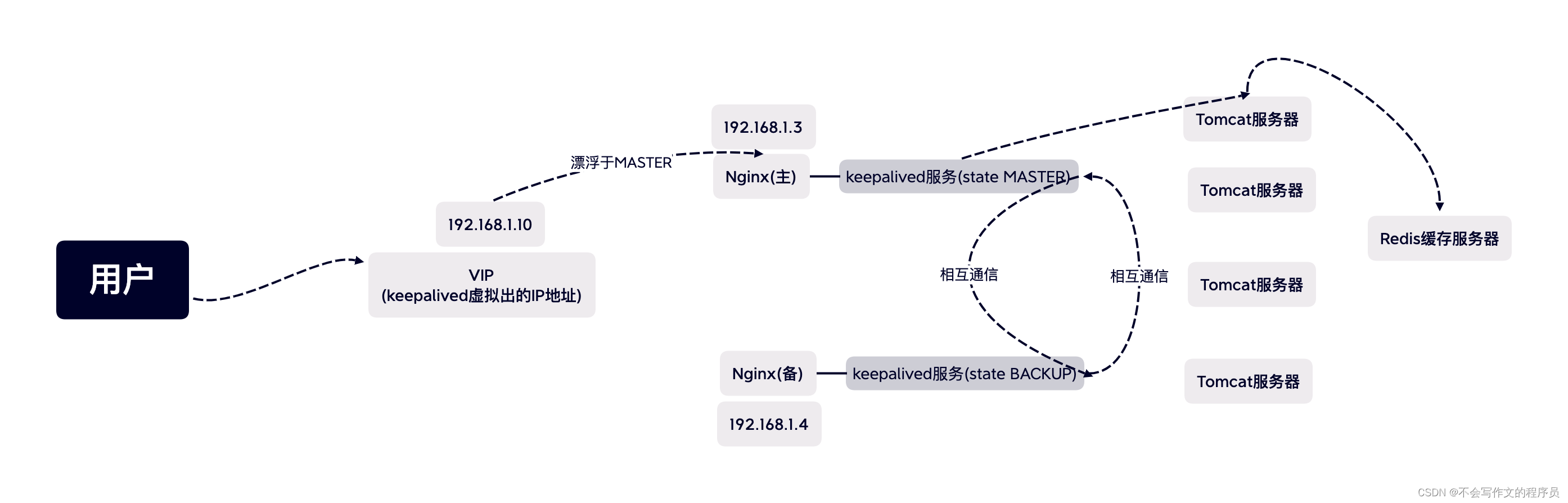 Keepalived:是Linux下面实现VRRP备份路由的高可靠性运行件。基于Keepalived设计的服务模式能够真正做到主服务器和备份服务器故障时IP瞬间无缝交接。