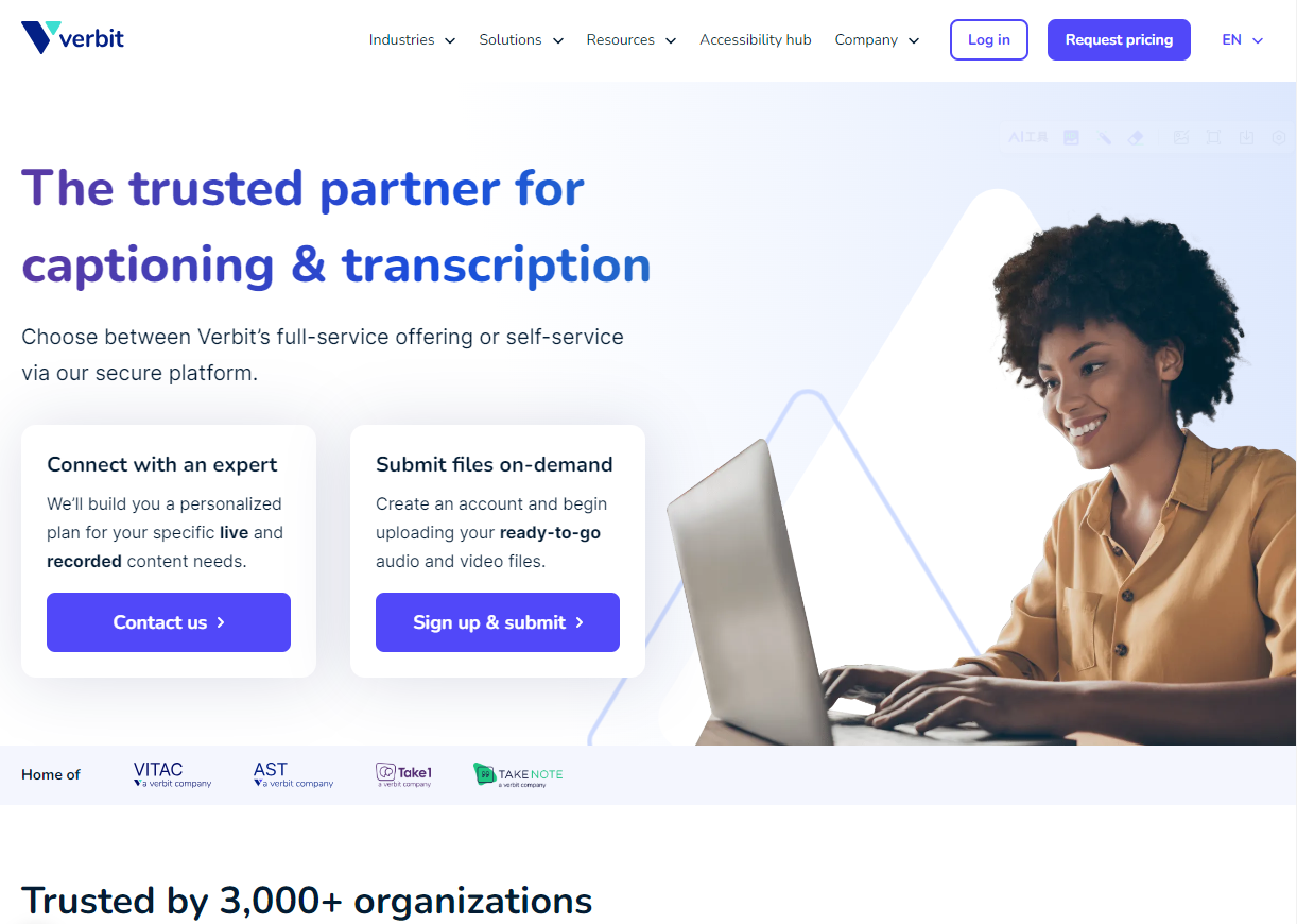 •软件简介:Verbit是一款更侧重于专业用途的语音转文字及翻译服务,它利用AI和人类编辑的混合模式,提供高精度的实时翻译和转录服务,确保专业场合的沟通准确无误。
