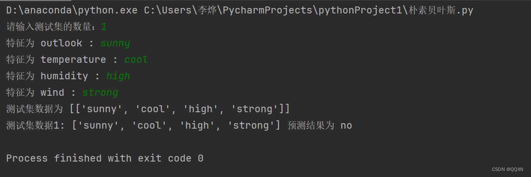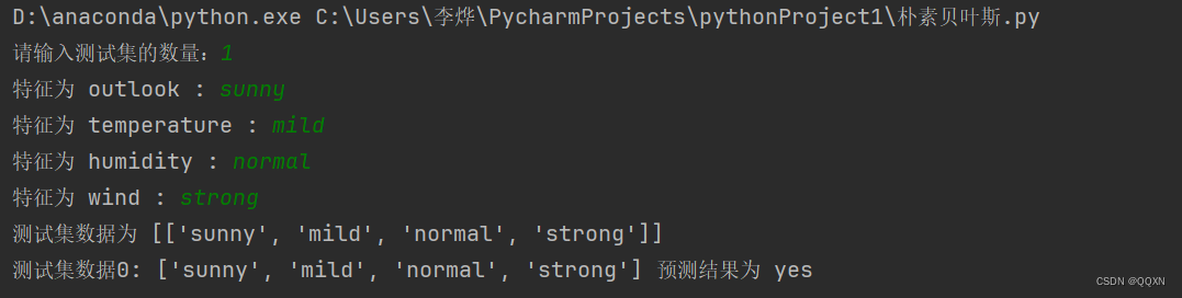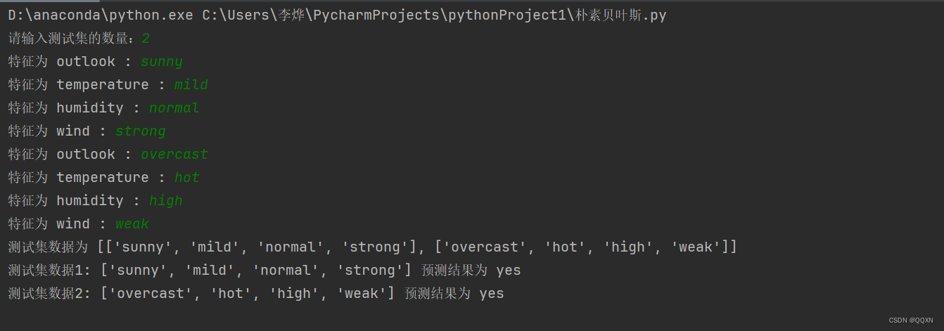 对于每个测试集得到一个对应的预测分类,存储在predictions = [];我们每一次取到一个测试集数据。假设取到的是sunny, mild, normal, strong,我们要预测他是否会外出打乒乓球。我们就要遍历每一种类别得到这个数据预测为改类别的概率。我们用max_prob和predicted_class来记录预测概率最大的类别。因为我们是朴素贝叶斯,是假设每个特征之间相互独立的,所以计算起来就只需要把该类别对应的特征的概率累乘运行就可以得到该类别i下的后验概率,我们在所有类别后验概率中选取概率最大的那一个作为答案即可。