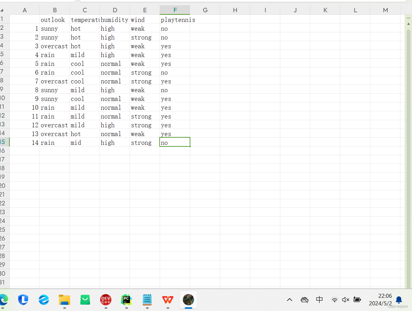 朴素贝叶斯是一种用于分类和预测任务的算法,他的原理是基于贝叶斯定理。其中朴素的意思是假设各特征之间相互独立。这个实验我是用的老师课后作业的题目预测某天是否会打网球,假设每个特征独立。