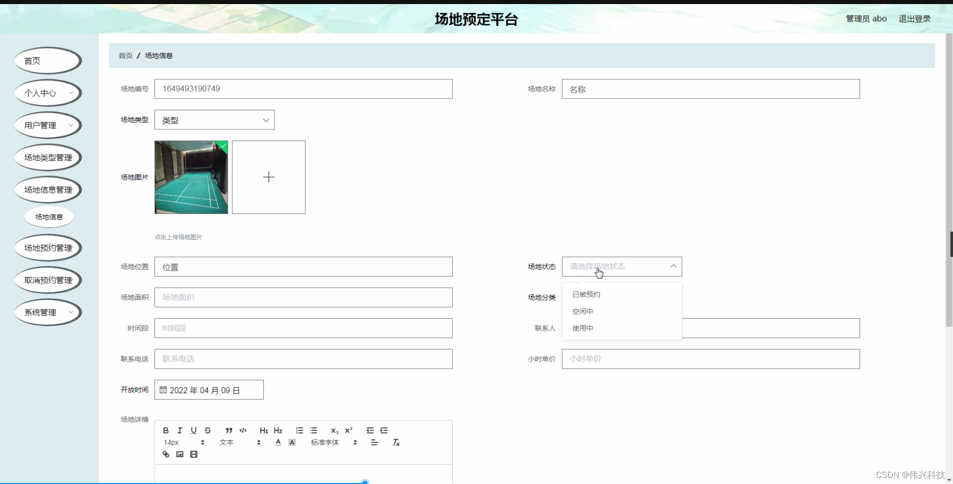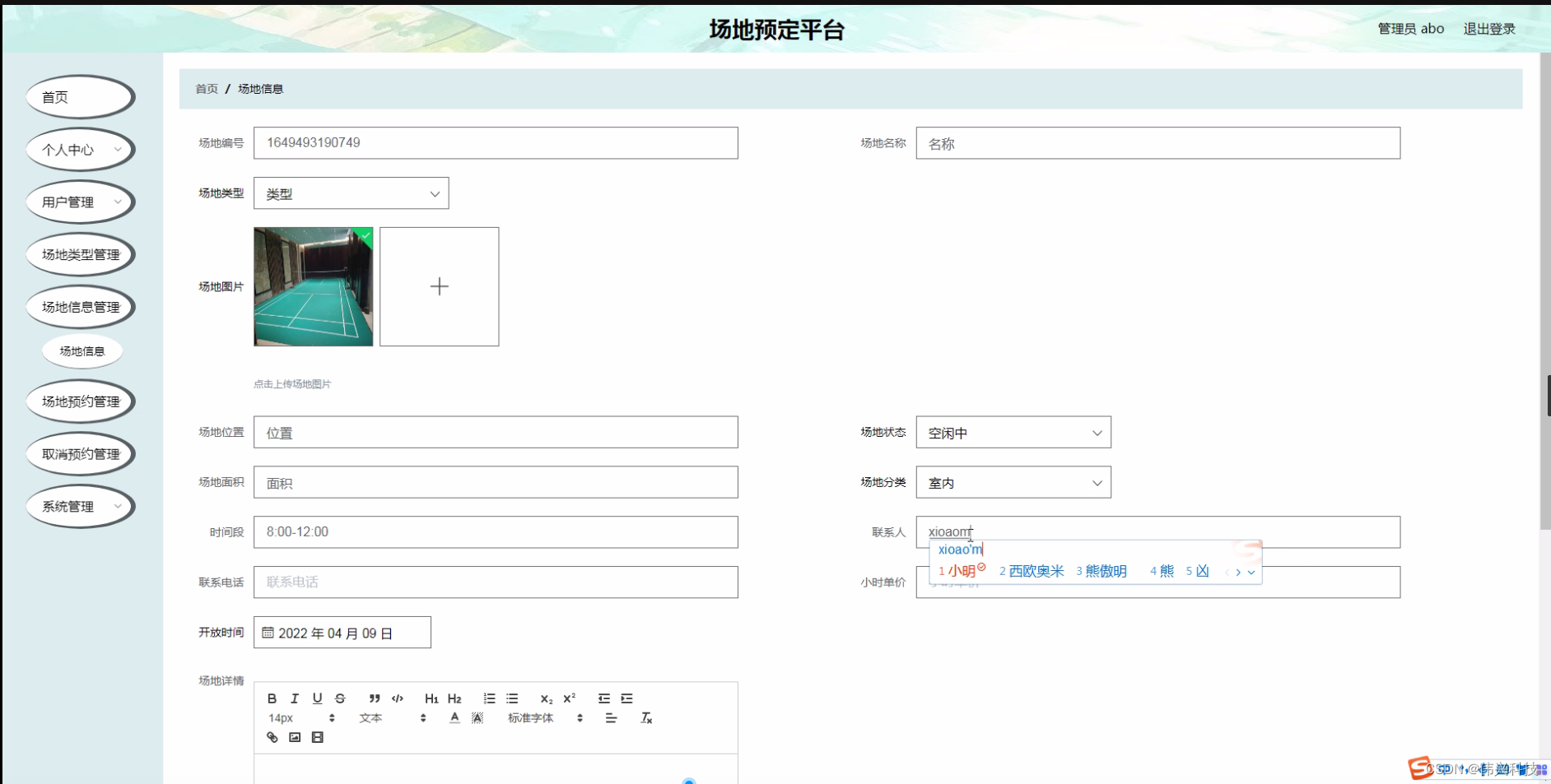 本项目是一款基于SSM框架的场地预定平台,采用Java+Vue+Mybatis技术栈,支持Eclipse/IDEA开发环境及Maven管理。提供管理员账号abo,密码abo进行系统管理。