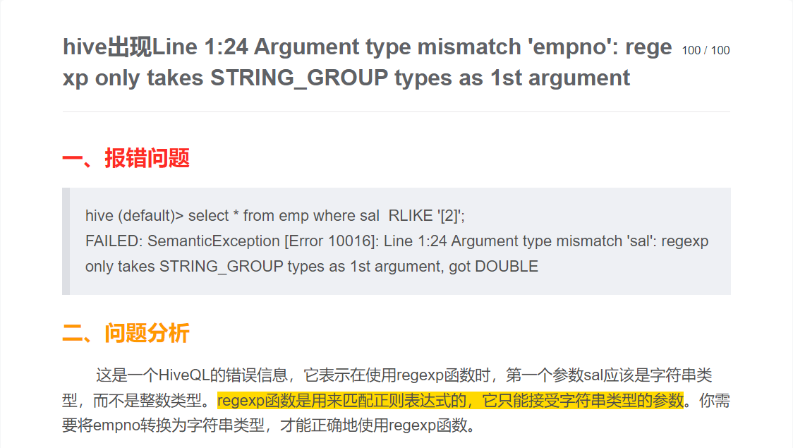 hive出现Line 1:24 Argument type mismatch ‘empno‘: regexp only takes STRING_GROUP types as 1st argument 本文出现的问题是hive使用Rlike进行查询时报错,主要原因是regexp函数是用来匹配正则表达式的,它只能接受字符串类型的参数。所以我们要进行类型转换然后再查询。你可以使用HiveQL内置的cast函数来实现类型转换,例如将sal转换为字符串类型的写法是:cast(sal as string)。这是一个HiveQL的错误信息,它表示在使用regexp函数时,第一个参数sal应该是字符串类型,而不是整数类型。regexp函数是用来匹配正则表达式的,它只能接受字符串类型的参数。