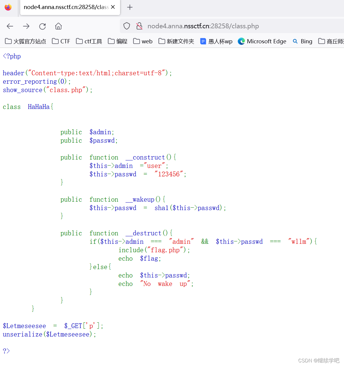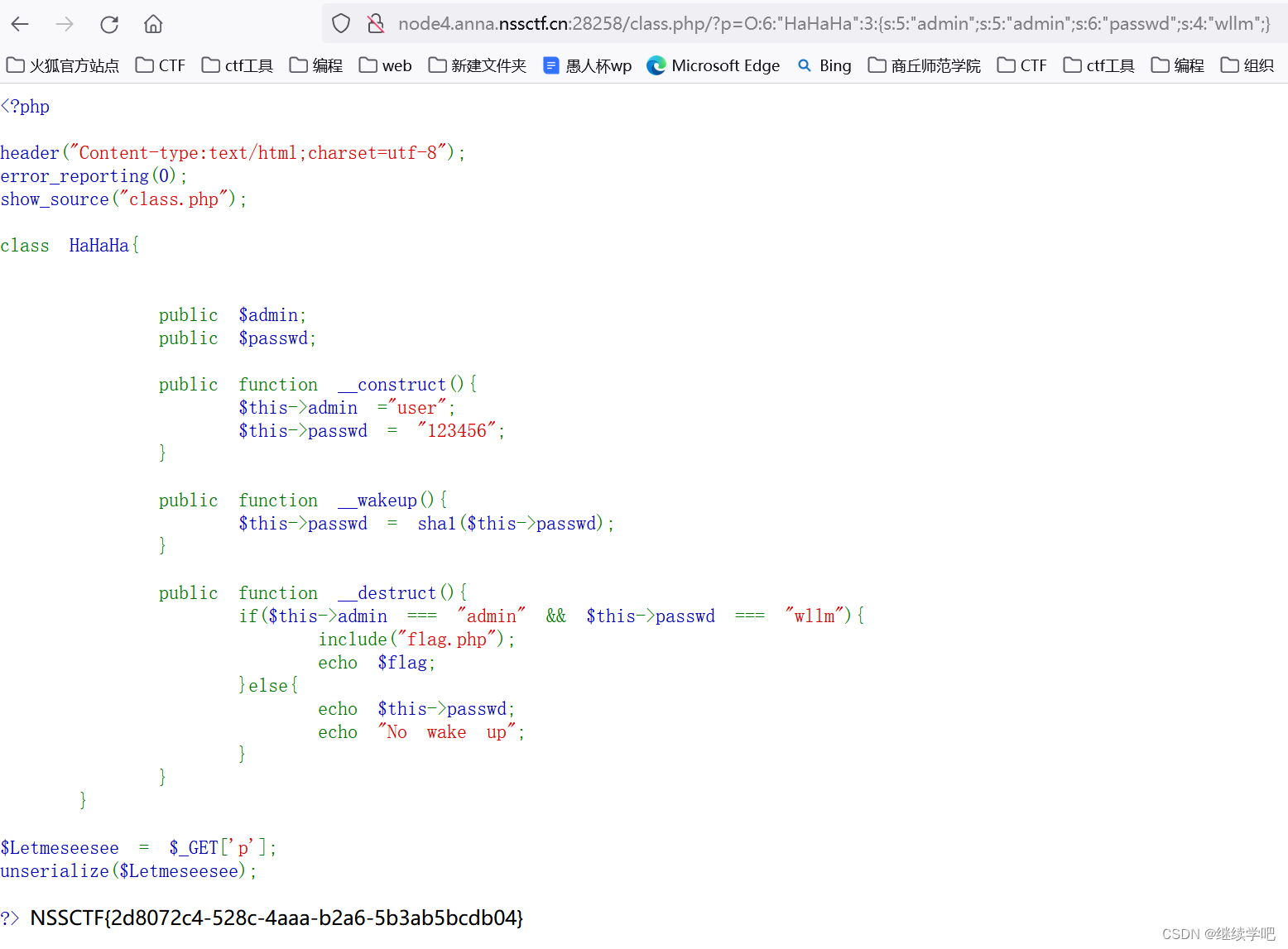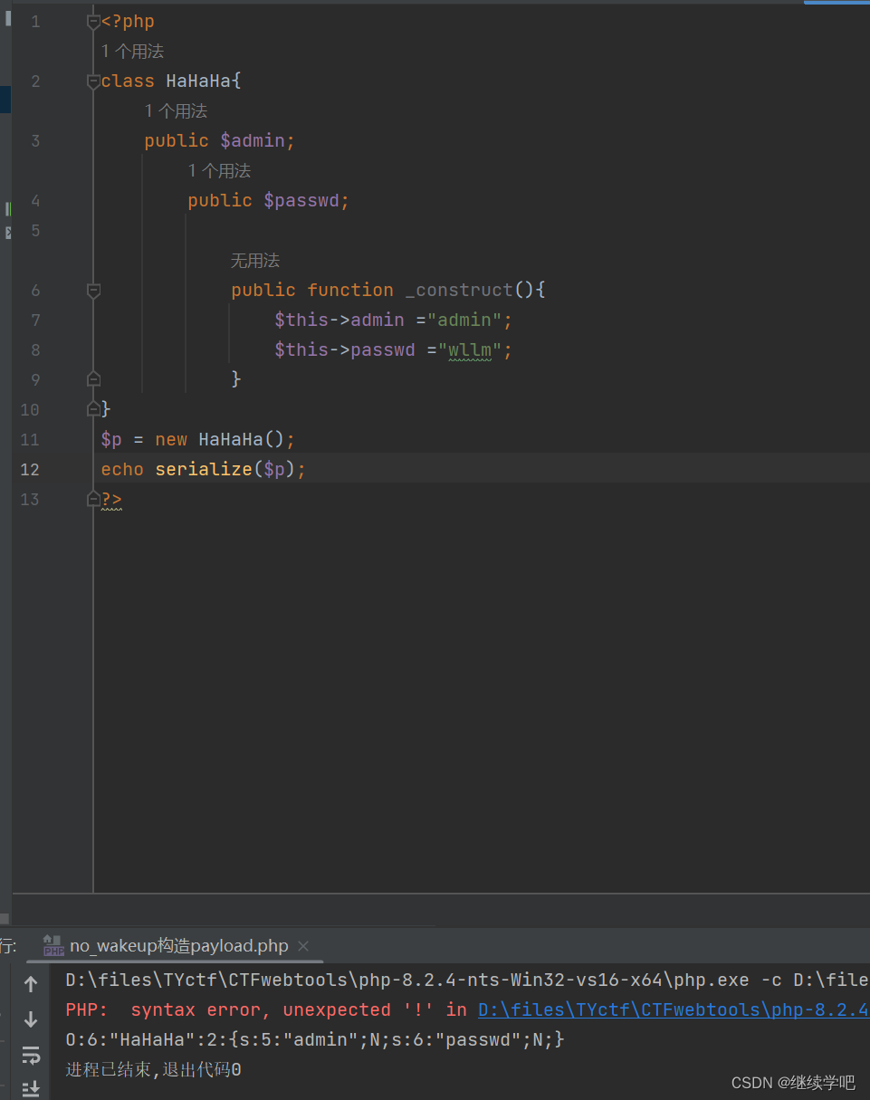 对于上述代码,我们需要给$this->admin赋值admin,给$this->passwd赋值wllm,同时需要绕过__wakeup()