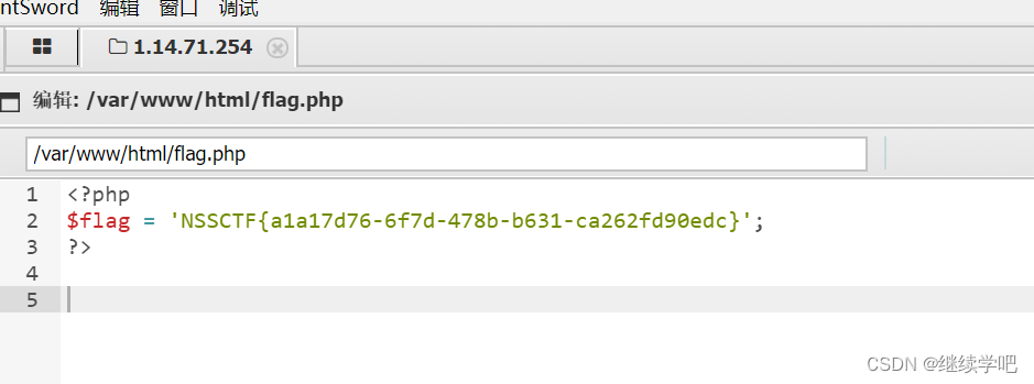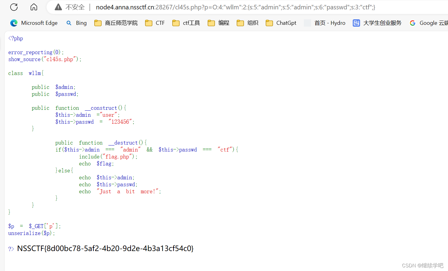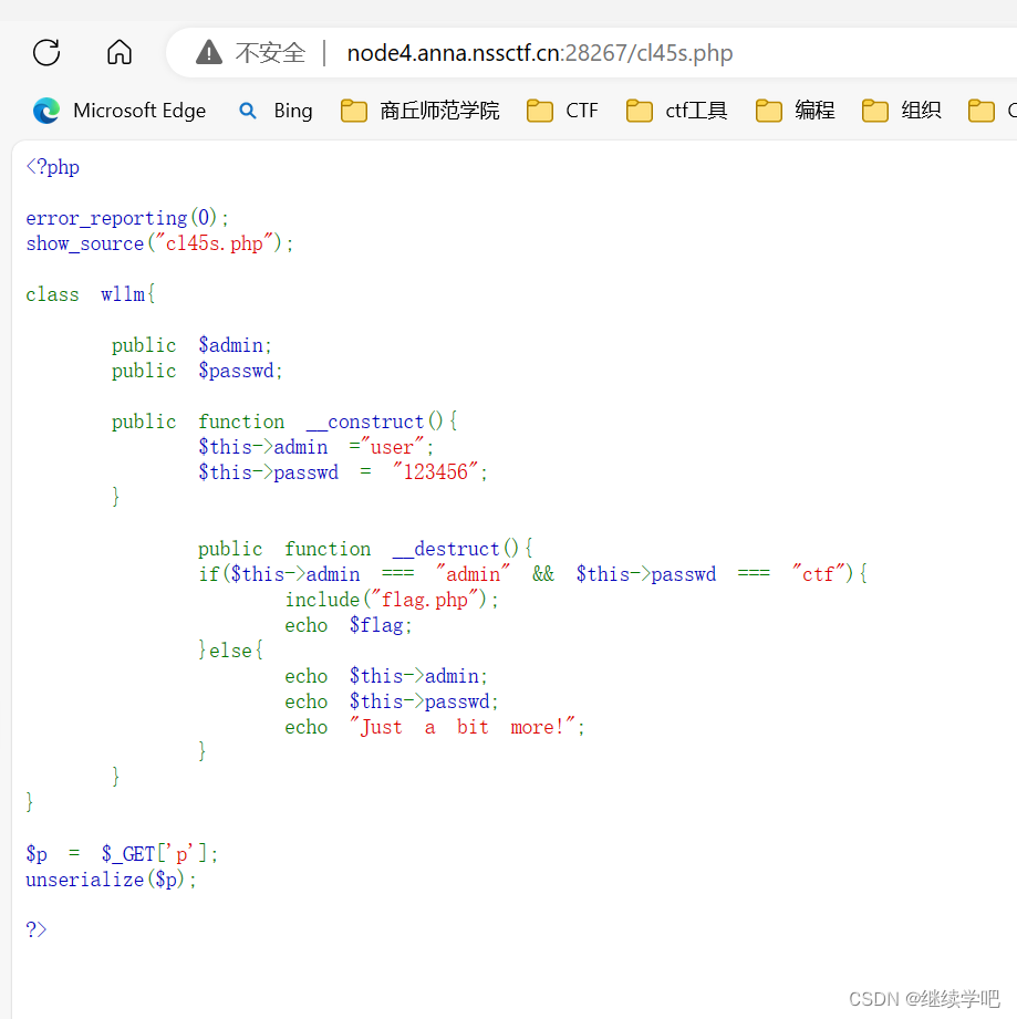 在类的析构函数中,首先检查admin属性是否等于字符串"admin"且passwd属性是否等于字符串"ctf"。如果条件成立,则包含一个名为"flag.php"的文件,并输出其中的变量$flag的值。否则,输出admin、passwd属性的值以及字符串"Just a bit more!"。