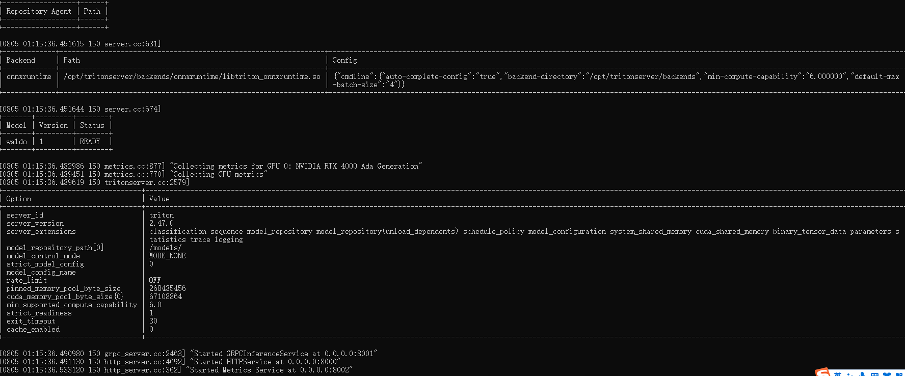 在docker容器终端运行tritonserver --model-repository=/models/,出现以下界面即为模型启动成功,就可以在client端进行调用了