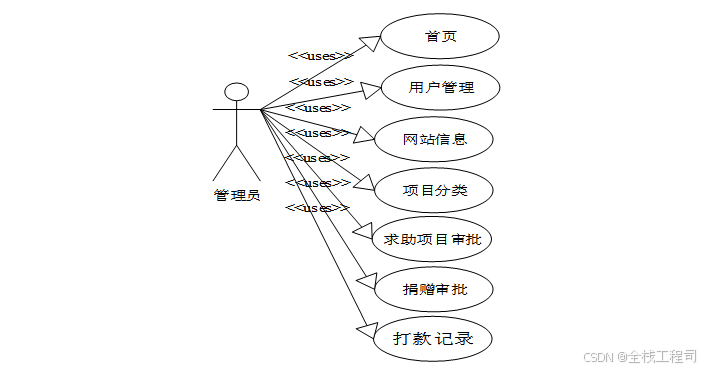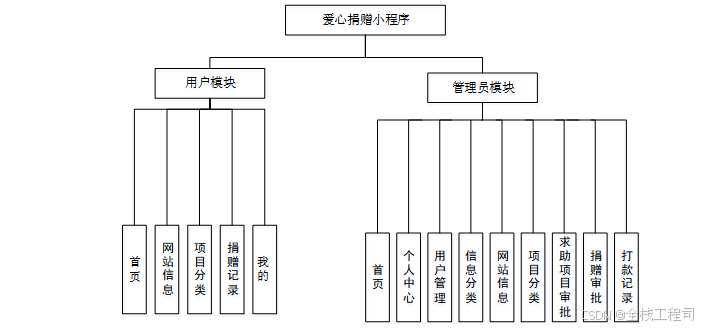 基于爱心捐赠小程序管理系统的设计基于现有的手机,可以实现管理员,首页、站点管理(轮播图、公告栏)、用户管理(管理员、普通用户)、内容模块(网站信息、信息分类)模块管理(项目分类、求助项目审批、捐赠审批、打款记录)等详细的了解及统计分析。根据系统功能需求建立的模块关系图如下图: