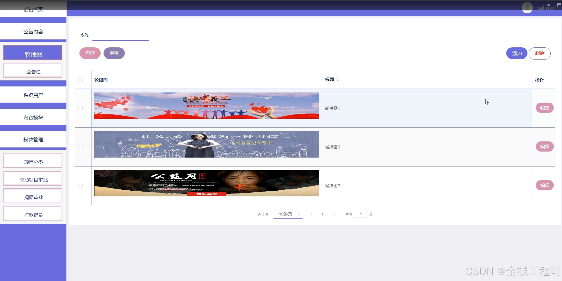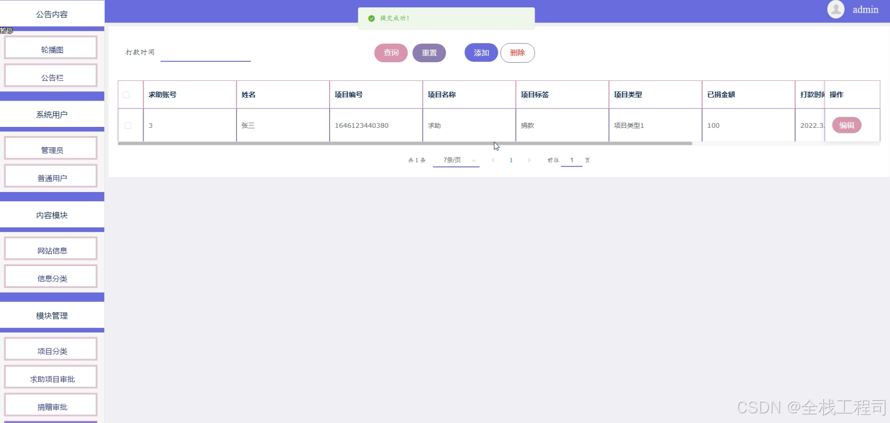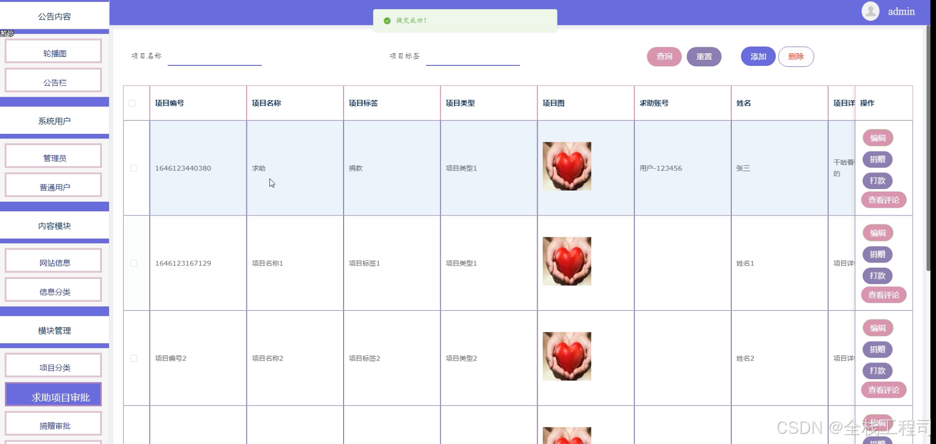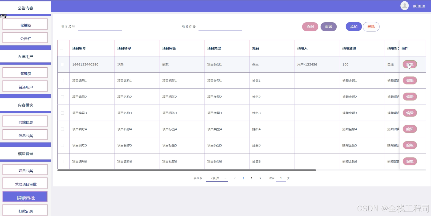 捐赠审批展示,管理员通过输入项目编号、项目名称、项目标签、项目类型、姓名、捐赠人捐赠金额、捐赠留言等查询、添加删除操作,如图5-9所示