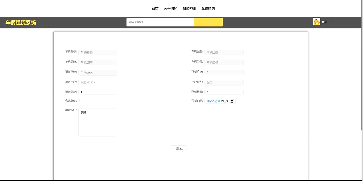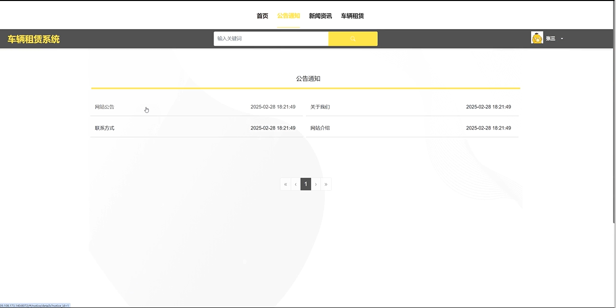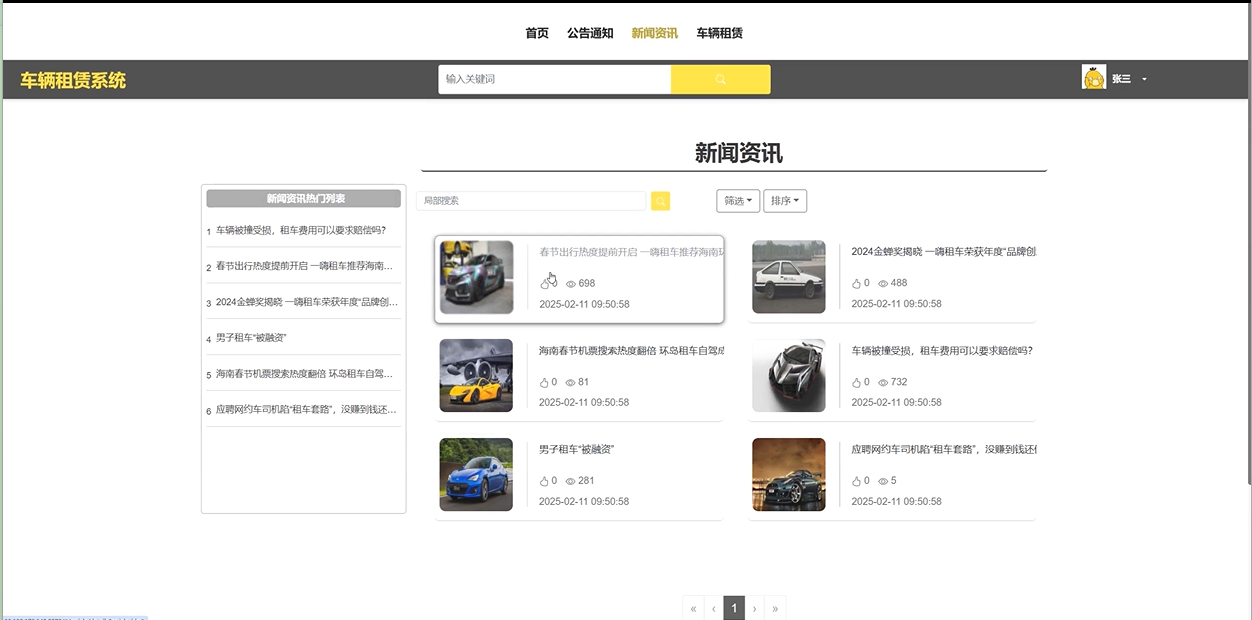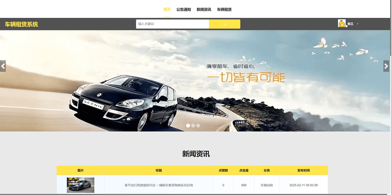 首页:首页包含轮播图展示、新闻资讯、导航栏以及车辆租赁推荐等内容。系统采用遗传算法对用户的点击、评论、收藏、点赞等行为数据进行统计、预测和分析,从而精准推荐用户可能感兴趣的车辆租赁信息。首页还提供搜索功能,便于用户快速查找所需内容,提高使用效率。