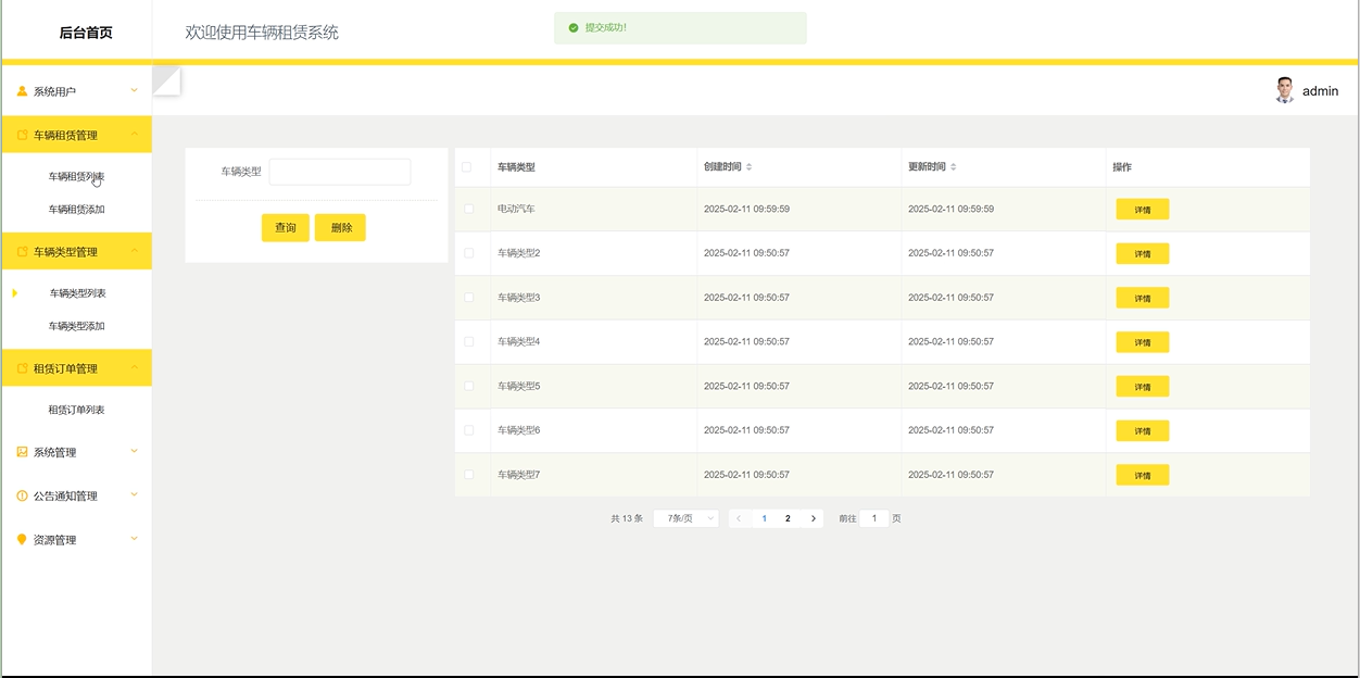 车辆类型管理:管理员可以管理系统中的车辆类型,查看已有类型的详细信息,并支持添加新类型。提供搜索、查询、删除功能,确保车辆分类合理,便于用户筛选合适的租赁车辆。