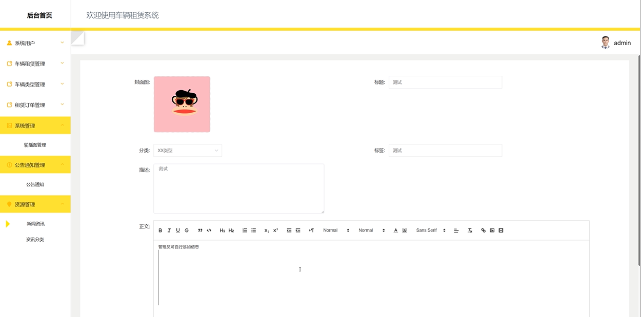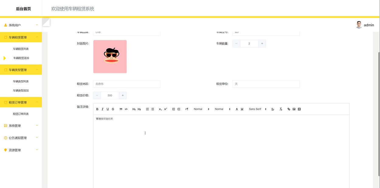 车辆租赁管理:管理员可以查看所有租赁车辆的详细信息,并查看用户对租赁车辆的评论。同时支持添加新车辆,进行搜索、查询及删除操作,确保车辆信息的完整性和准确性。