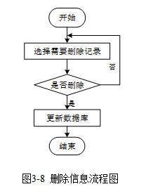 用户选择需要删除的记录后,系统判断是否确认删除。若未确认,返回选择环节,若确认删除,则更新数据库,删除对应记录,完成操作后流程结束。删除信息流程图如下图所示。