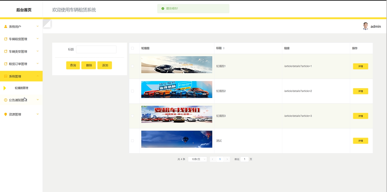 系统管理:管理员可以管理网站首页的轮播图,支持查看详情、查询、删除及添加新轮播图,以优化页面展示效果,提升用户体验。