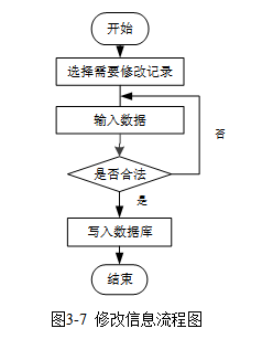 用户首先选择需要修改的记录,输入修改后的数据,系统判断输入数据是否合法。若数据不合法,提示重新输入,若数据合法,则将修改后的数据写入数据库,完成操作后流程结束。修改信息流程图如下图所示。