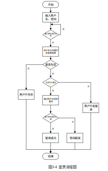 用户输入用户名和密码后,系统先检查输入是否为空,再验证用户名是否存在,若存在则通过用户名获取密码并校验。若密码正确则登录成功,否则提示密码错误。若用户名不存在或无法登录,提示用户操作无效。如下图所示。