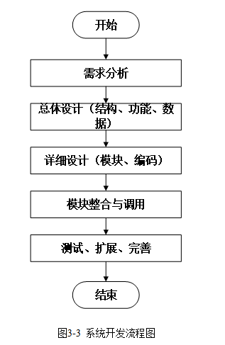 系统开发流程的主要步骤,从需求分析到系统完成的全过程。流程包括需求分析、总体设计(结构、功能、数据)、详细设计(模块、编码)、模块整合与调用,以及测试、扩展和完善,最终完成系统的开发。本系统的开发流程如下图所示