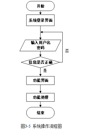 用户首先进入系统登录界面,输入用户名和密码后,系统验证信息是否正确。若验证失败,返回登录界面重新输入,若验证成功,则进入功能界面,执行相应功能处理后结束操作流程。操作流程如下图所示。