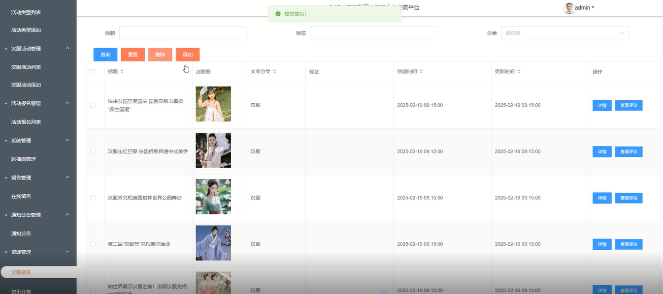 通过资源管理页面,管理员可以查看资源管理的汉服资讯、资讯分类等信息,并进行查询、重置、删除、添加等操作。界面如下图所示。
