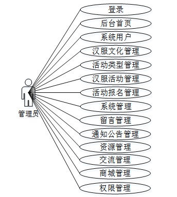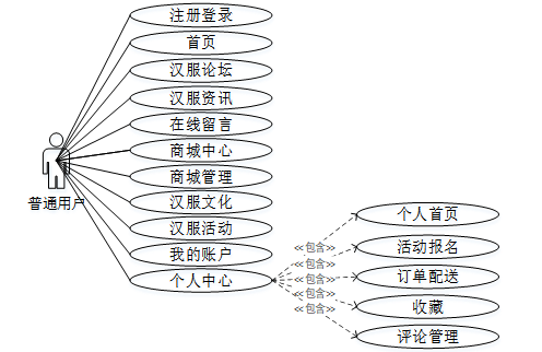 系统的用例展示的是系统功能与用户之间的关系,通过用例的方式能够直观的展示出来,本“汉韵甄选”汉服文化交流平台的完整UML用例图所示。
