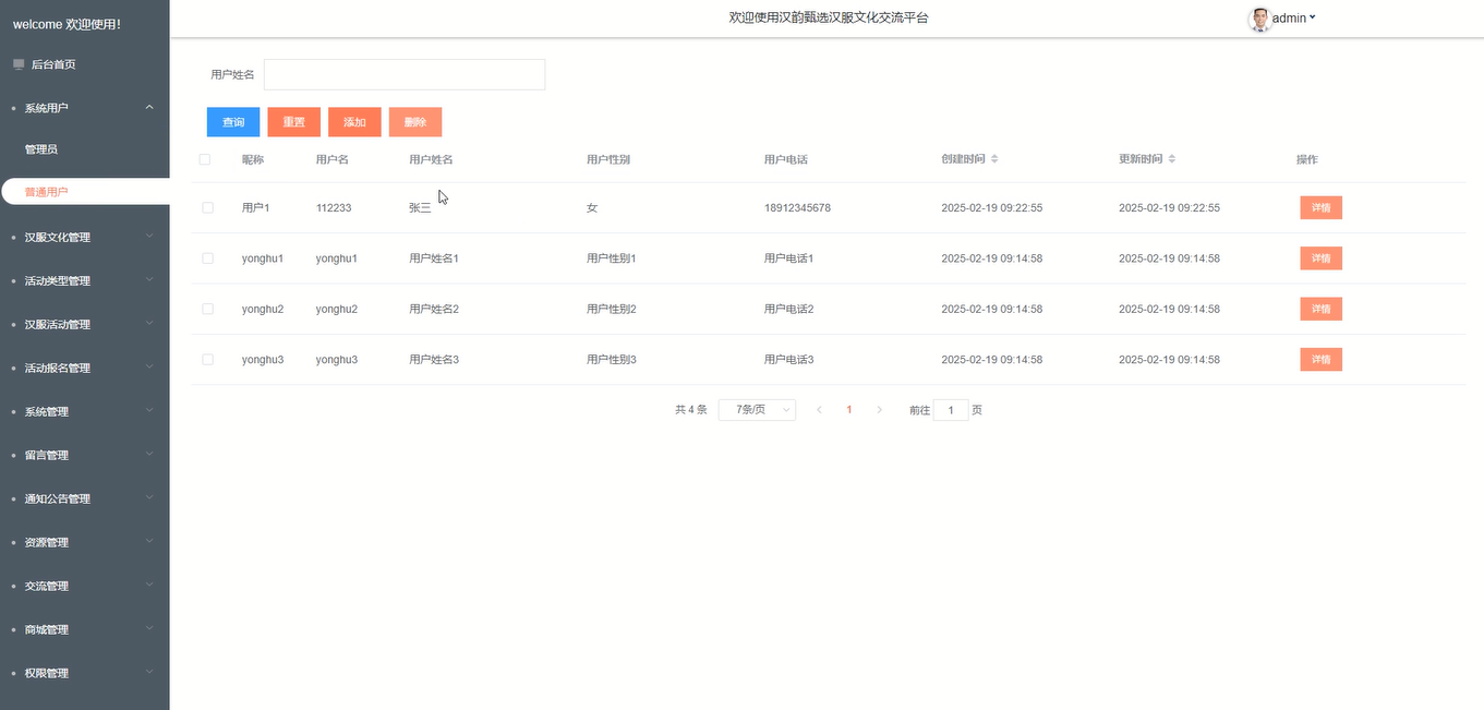 The platform is mainly divided into two roles: ordinary users and administrators. Ordinary users can register and log in, browse homepage information, participate in Hanfu forum discussions, obtain the latest Hanfu information, leave online messages, visit the mall center to purchase Hanfu and related accessories, and participate in various Hanfu activities. In addition, users can also manage personal account information, view activity registration status, track order delivery status, and more. Administrators are responsible for backend management such as system user management, content review, activity organization, resource management, and permission settings to ensure the normal operation and content quality of the platform.