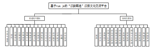 本“汉韵甄选”汉服文化交流平台是一个集信息查询、发布、管理为一体的平台,在功能上实现了前台和后台两部分的功能,根据第三章的系统功能分析,得出本“汉韵甄选”汉服文化交流平台的功能模块图,如图所示。