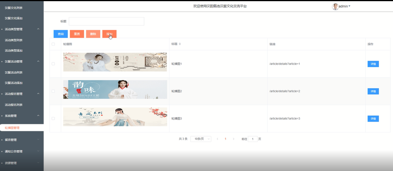 通过系统管理页面,管理员可以查看轮播图的详细信息,并进行查询、重置、添加、删除等操作。界面如下图所示。