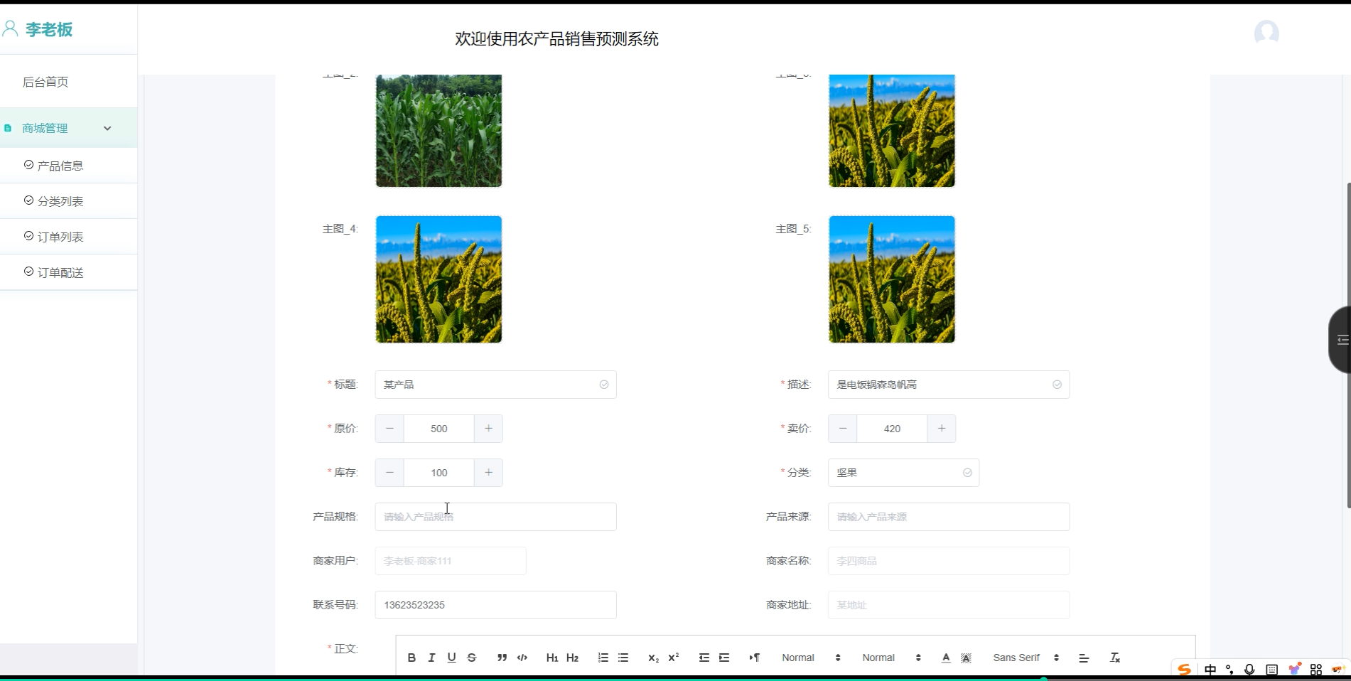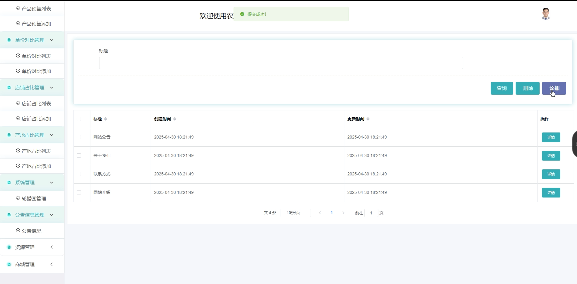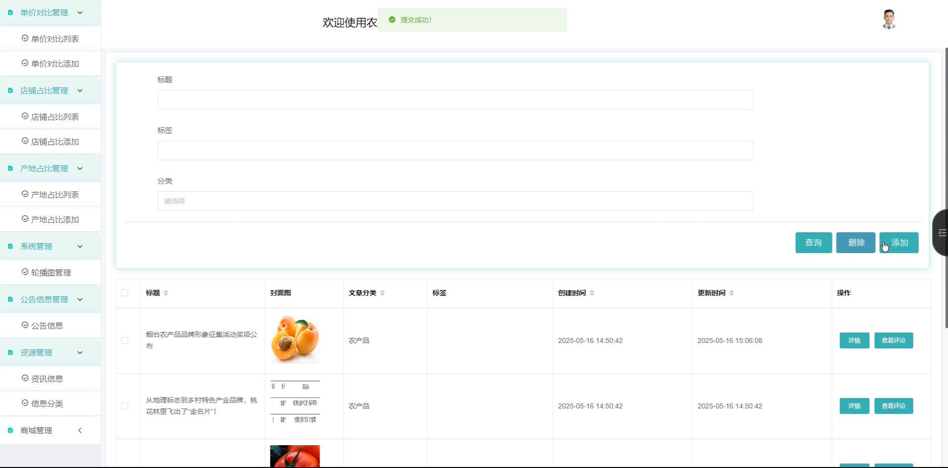 资源管理(资讯信息、信息分类):发布行业动态和农业资讯内容,支持分类管理。