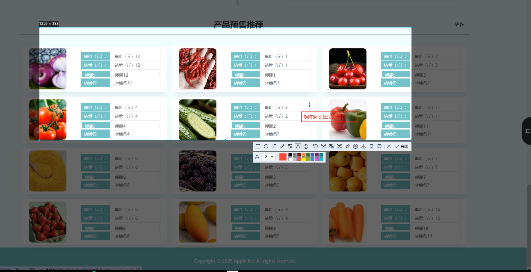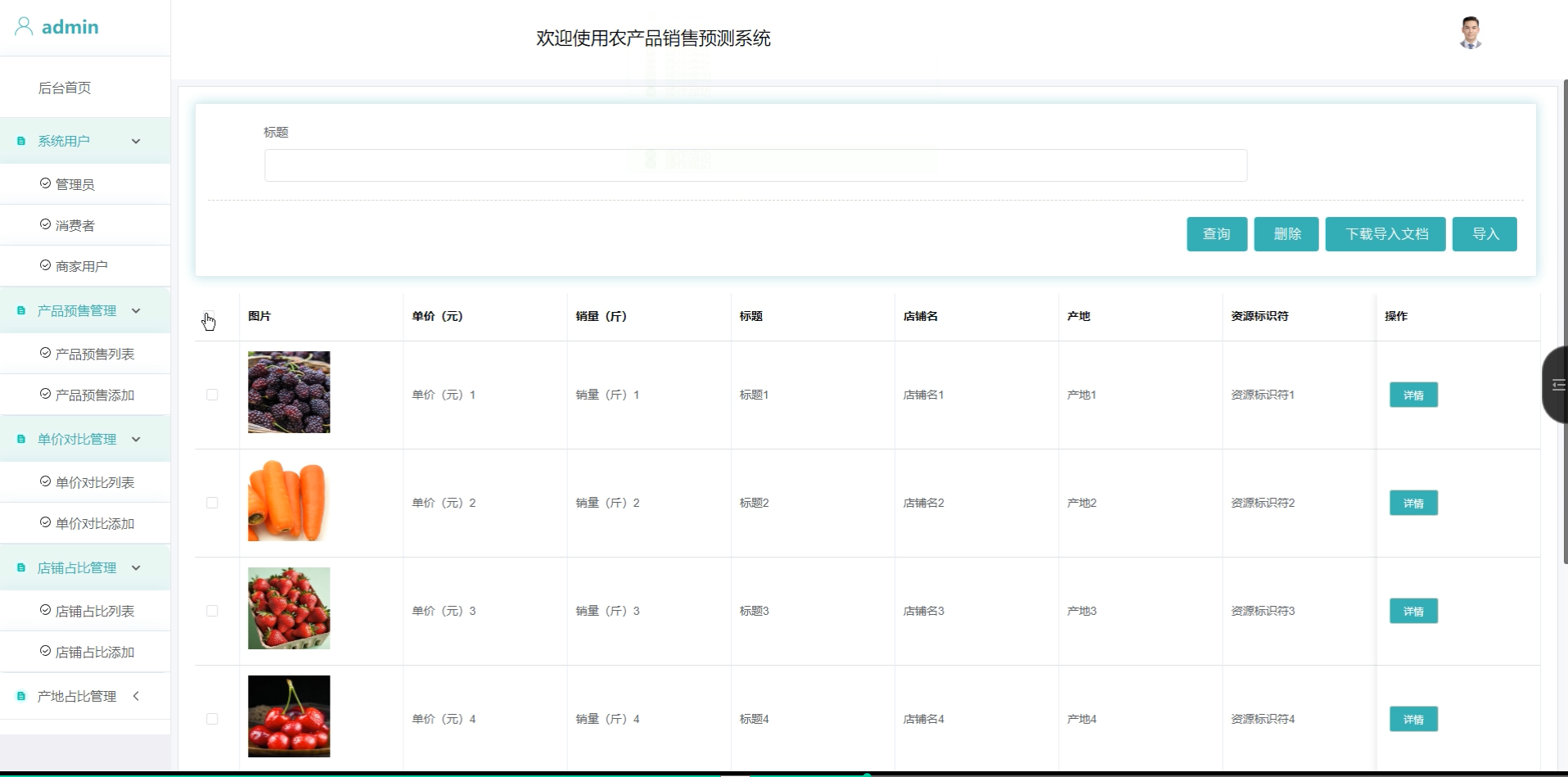 在销售数据分析方面,系统引入K-means聚类矩阵算法,对消费者行为、产品属性与交易记录进行聚类处理,形成精准的用户画像与商品分类,从而实现个性化推荐与供需结构优化。聚类结果还用于辅助单价对比、产地占比等模块的数据分析,提高图表展示的精度与决策参考价值。