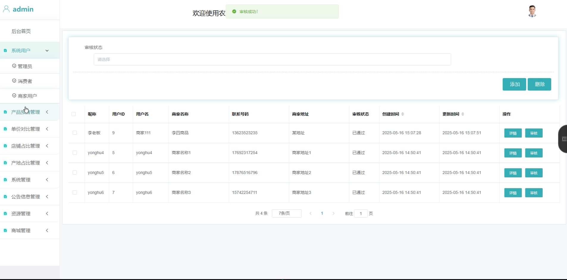 店铺占比管理:统计不同商家销售占比,辅助平台运营分析。
