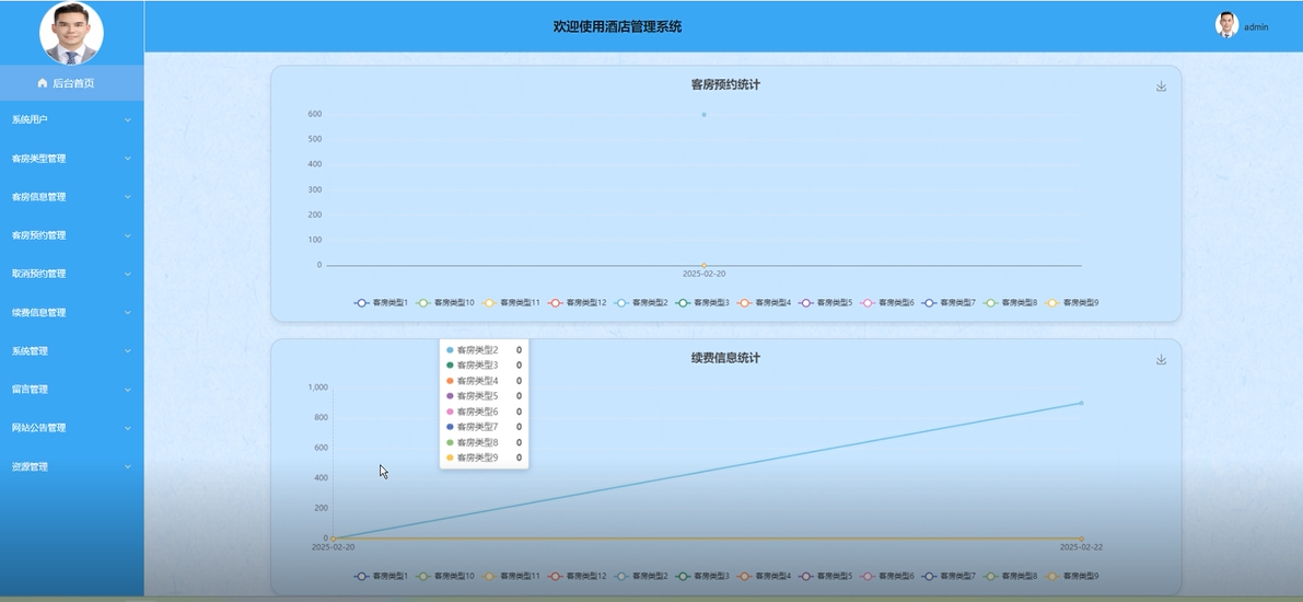 管理员登录系统可进行管理,拥有后台首页、系统用户、客房类型管理、客房信息管理、客房预约管理、取消预约管理、续费信息管理、系统管理、留言管理、网站公告管理、资源管理等功能。