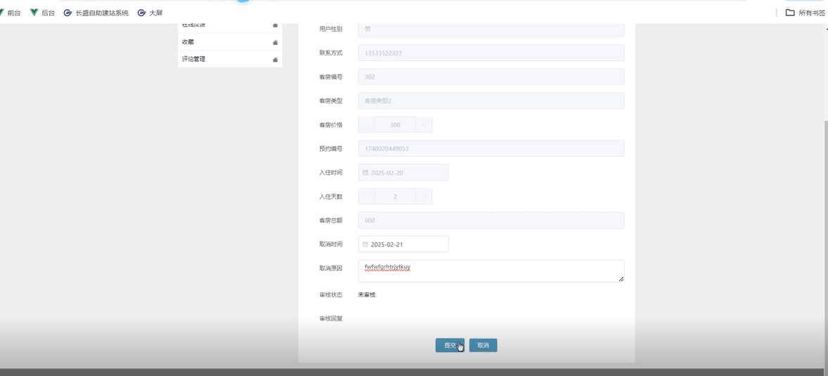 - 取消预约:允许用户在符合规定的时间内取消已预约的房间,提供取消政策的说明以及可能的退款信息,取消成功后,更新用户的个人主页与订单历史。