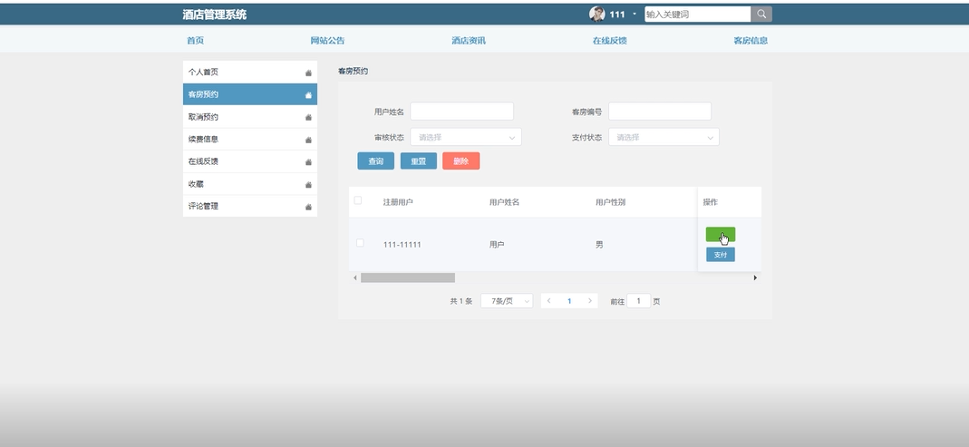 注册用户登录后可对自己的酒店进行跟进,包括我的账户、个人中心、个人首页、客房预约、取消预约、续费信息、在线反馈、收藏、评论管理等功能。